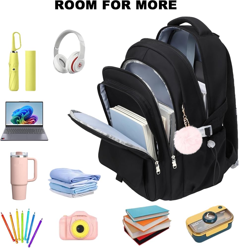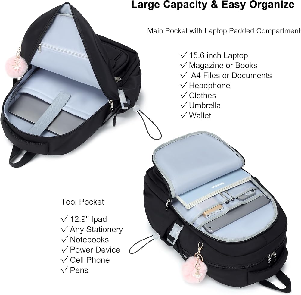 School Bag for Teens Girls,Girls Backpack Set,3 PCS Kids Backpack for Women,15.6 Inch Laptop Middle High School College Student Casual Travel Daypack with Lunch Box Pencil Pouch Set(Black)