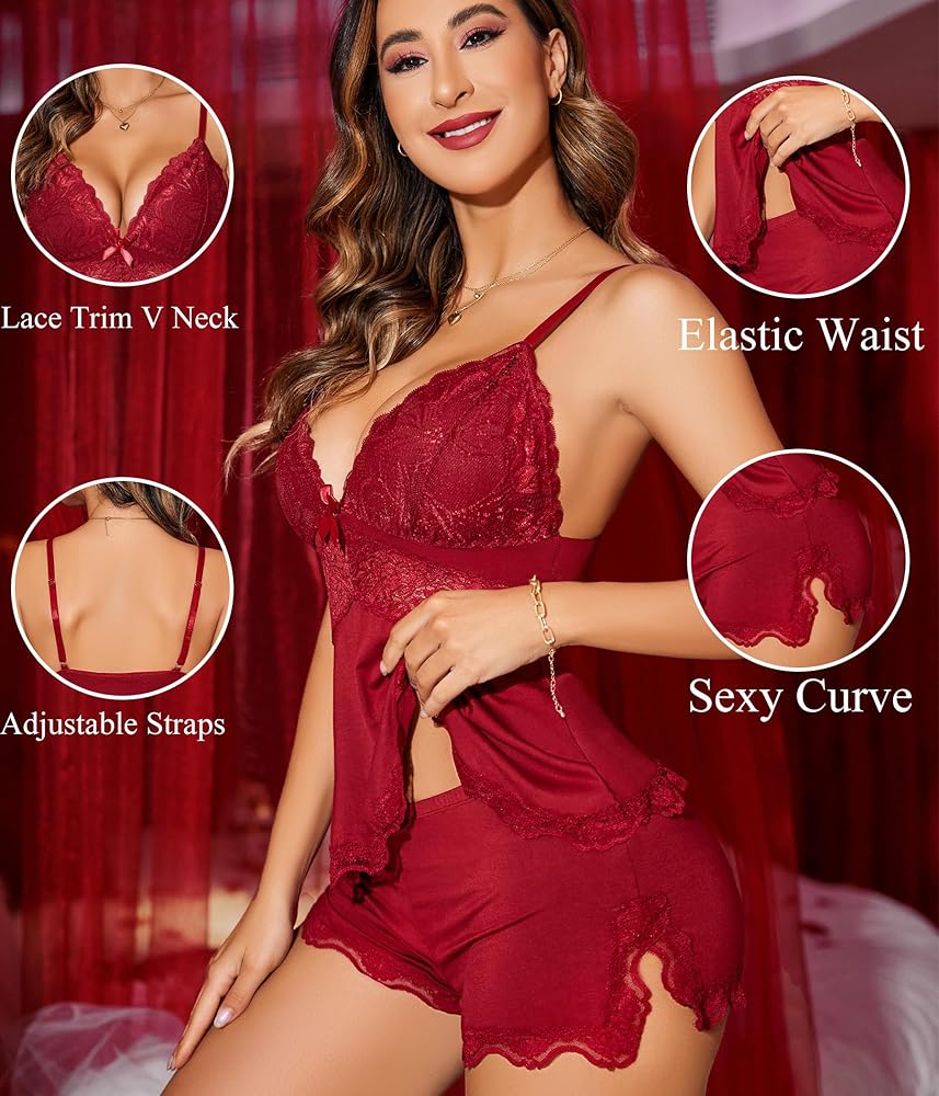 Sleeveless pajama set and v neckline with sheer lace panels, adjustable strap and stretchy waistband. Classic Pajamas sets in casual style, soft and lightweight. >Bottom: Shorts with a drawstring waistband to ensure the shorts remain easy to fit, floral lace detail on cups and both sides. Casual and stylish.