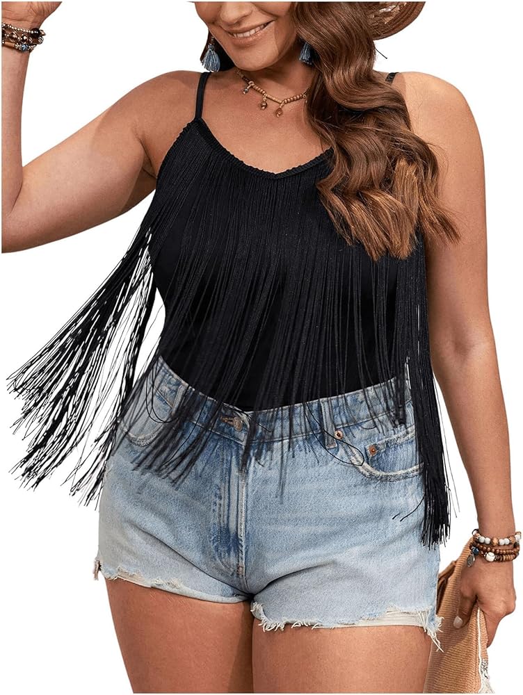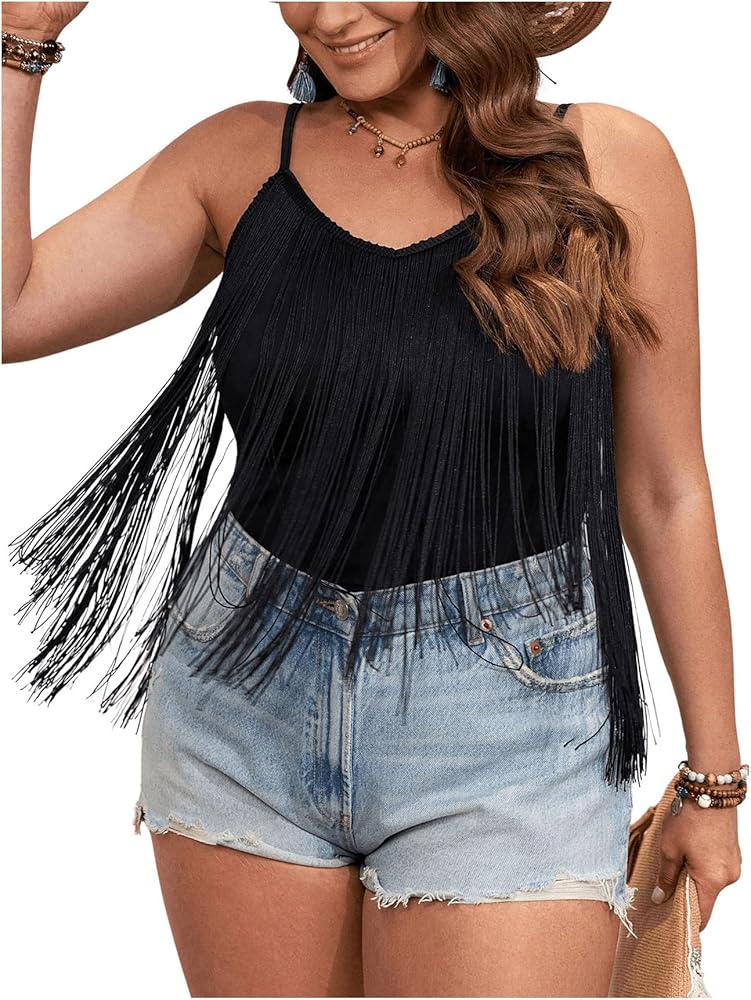 - Design: Fringe trim, crop cami top, sleeveless, spaghetti strap, plus size, regular fit, plain, clubwear