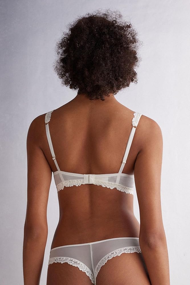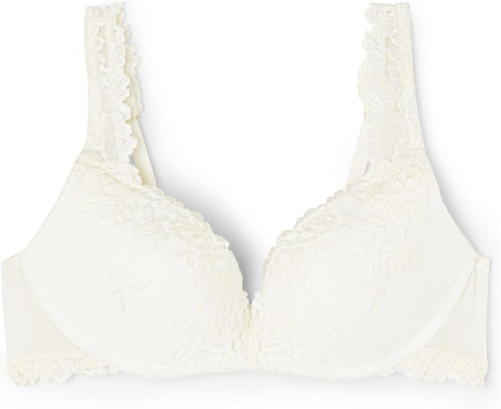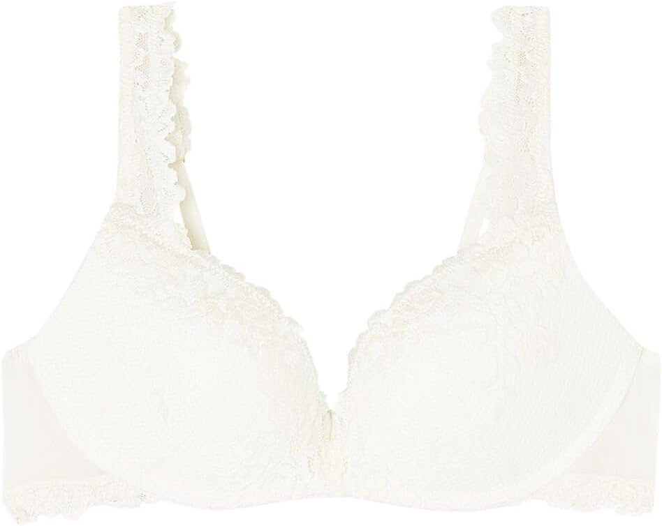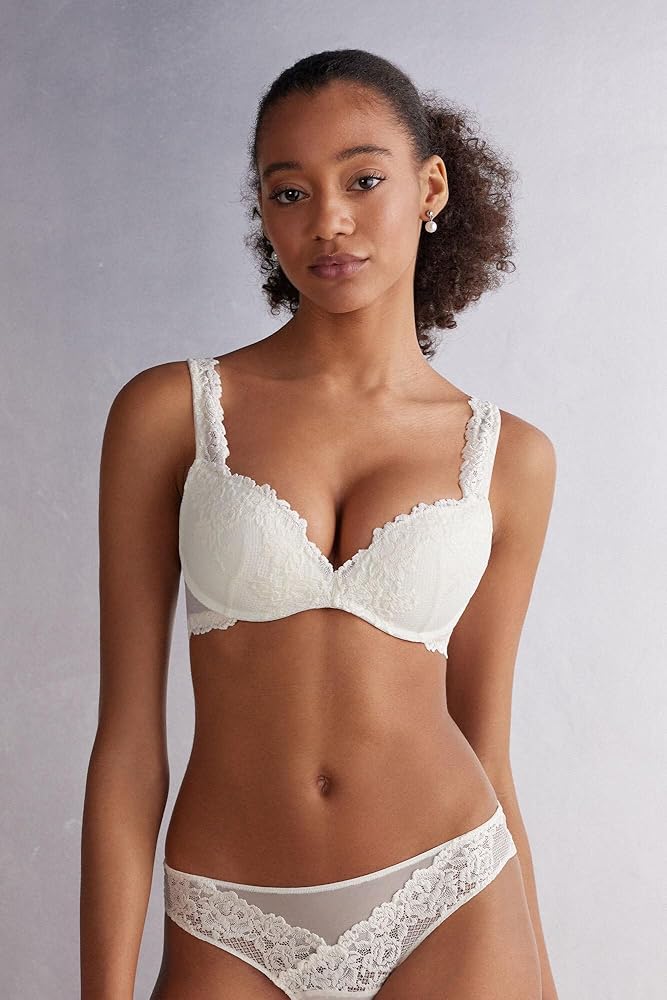 Wireless Gioia super push-up bra with heavily padded graduated molded cups. It is made with a sophisticated and elegant stretch lace that features either a tone-on-tone or contrast color floral embroidery, depending on the version presented. The straps are finished with lace are adjustable in back. Ideal design to achieve a two-sizes-larger effect to create a breathtaking décolleté. The model is 5' 9” (175 cm) tall and is wearing a size 2B / 75B / 34B / 85B / 42B.