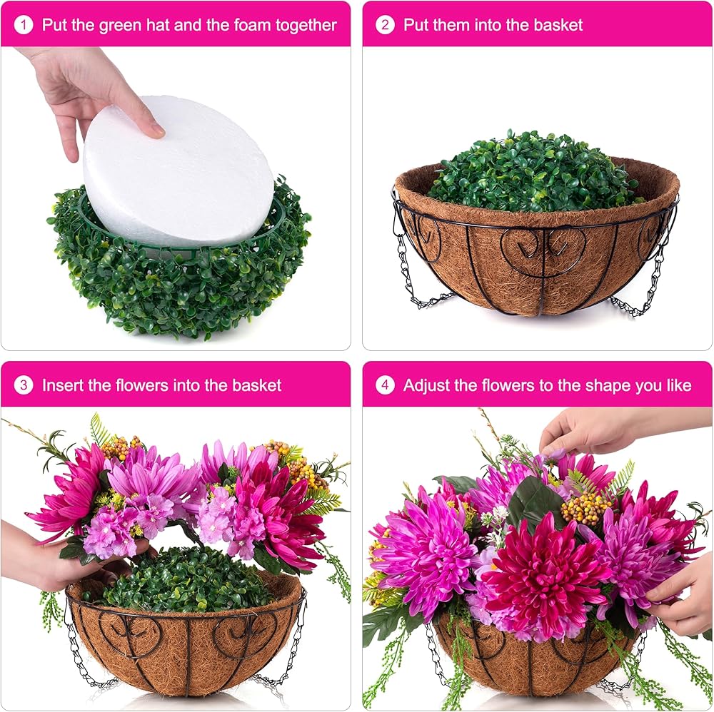 SIMPLE ASSEMBLY: HyeFlora artificial hanging plant needs 5 minutes to assemble. Simply place the silk flower branches to the basket and design the shape. Please refer to the pictures listed above if you need further instruction. SPECS: The size after assembly is approximately 13.5" x 13.5" x 15.5 "(LxWxH); The basket measures 12 " x 12" x 5.9 "(LxWxH) and the chain length is 13.78 inches.
