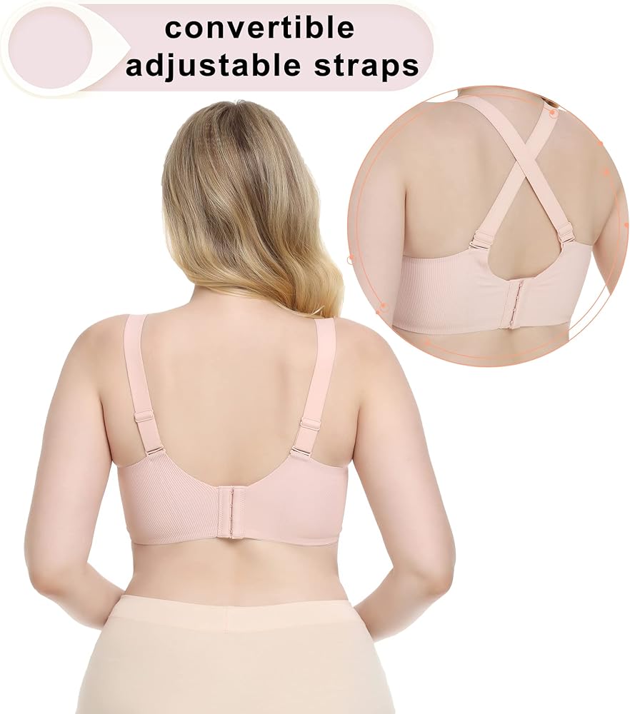 【The seamless bra with convertible straps】the straps of our seamless bras can easy convert to a cross back bra or everyday U back bra,4 row hooks back bras can provide more support and hide back fat, your ideal under outfit bras for women