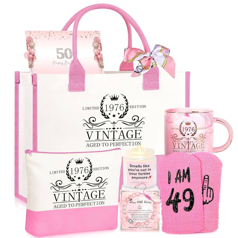 50th Gifts for Women Birthday Unique: The 1975 bracelet is crafted from natural gemstones and features a strong elastic cord that fits most women comfortably. Celebrate her milestone with this sweet and thoughtful 50th birthday gift. The cozy pink 50th socks are made from ultra-soft coral velvet, perfect for pampering her feet. The included greeting card opens up to reveal a fun, three-dimensional birthday cake design—adding a special touch to her 50th celebration