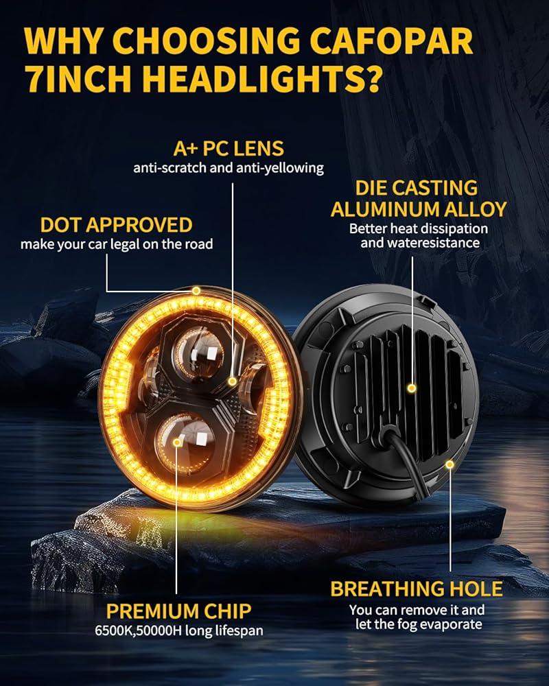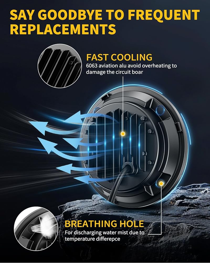 【Efficient Cooling Dissipation System】7 inch halo headlight housed in a solid cast 6063 aluminum casing to avoid overheating damage to the circuit board. Meanwhile, a breathing hole efficiently discharges water mist caused by temperature difference. If moisture ever starts developing inside CAFOPAR headlights, simply open the breather boards and run them for about two hours—this should fix the issue. Ensures a longer lifespan of over 100,000 hours. Even after a decade, it'll still shine as bright as new