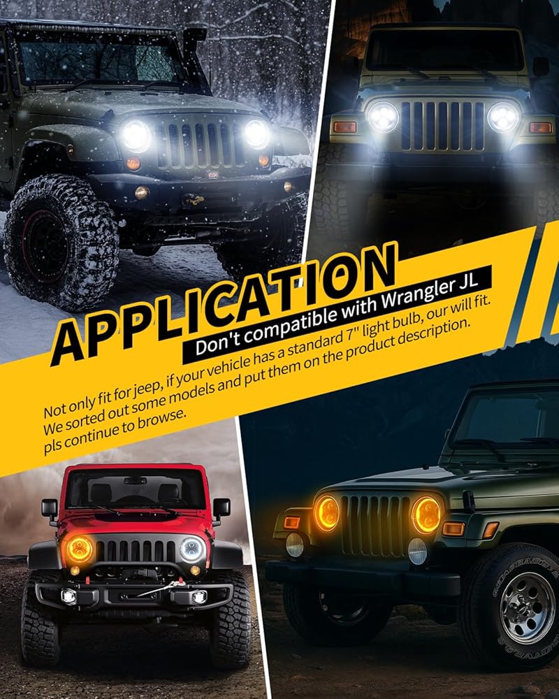 【Wide Application】7'' Led headlight compatible with Jee-p wrangler JK 2/4 Door 2007-2018; Compatible with Jee-p wrangler TJ 1997-2006; Compatible with Jee-p wrangler CJ-7 1976-1986; Compatible with Jee-p wrangler TJ unlimited/LJ 2003-2006; Compatible with CJ-8 scrambler 1981-1985; Compatible with Ma-zda miata; Compatible with Che-vy. Pls check the size of your vehicle bucket