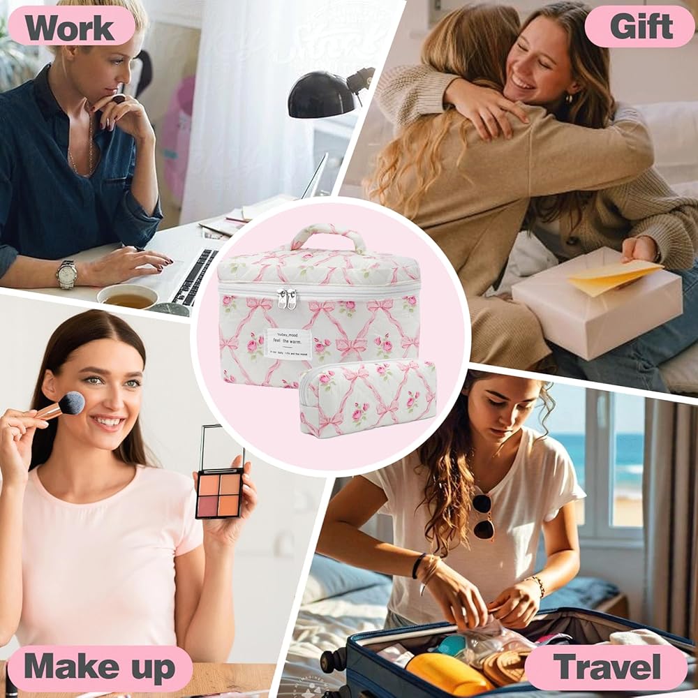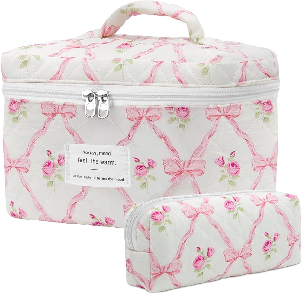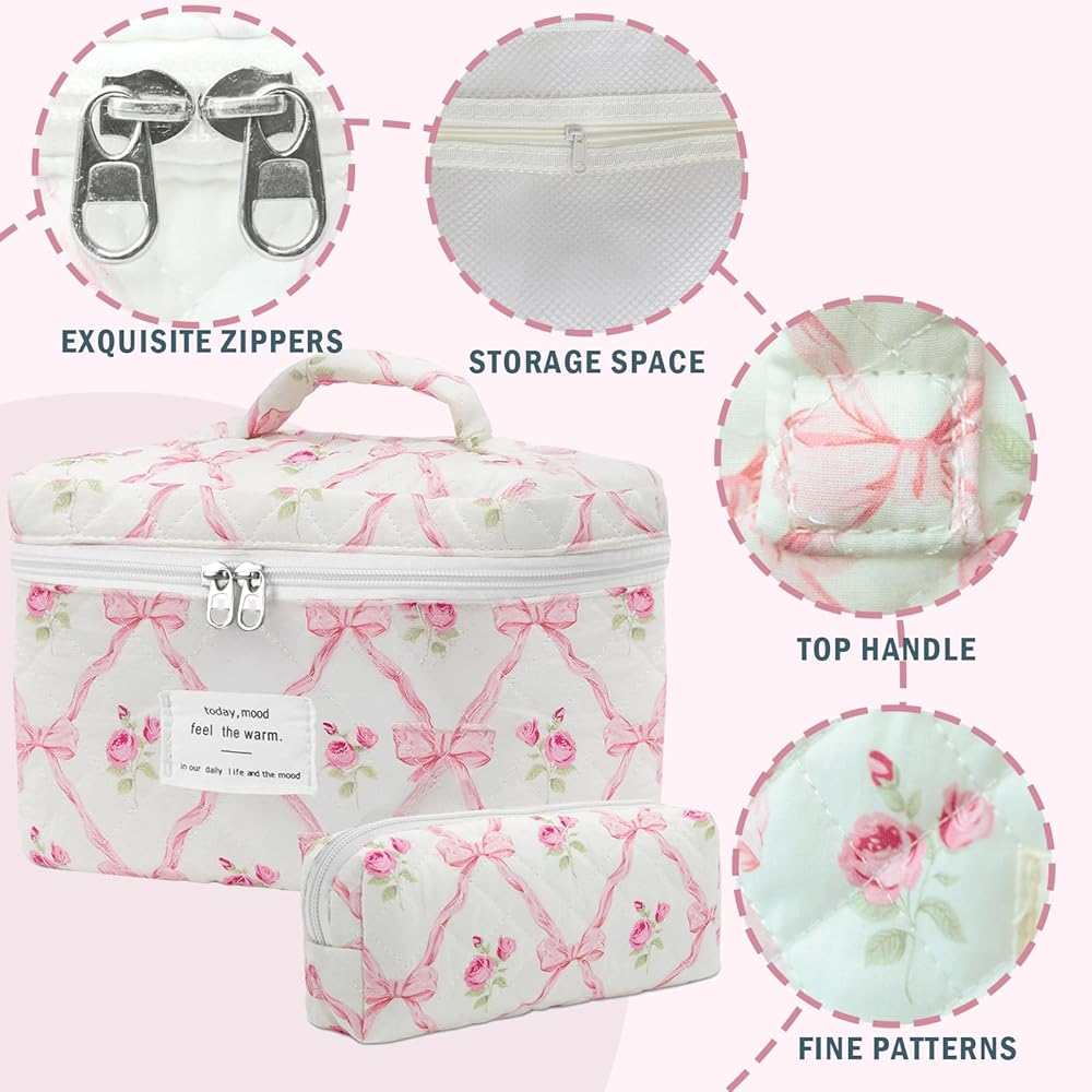 Product Size: This 2pcs floral cotton makeup bags includes one large and one small bag, perfect for home organization and travel storage.Large makeup bag: 10 inches x 6 inches x 5.5 inches, Small makeup pouch: 7.5 inches x 2.4 inches x 3.5 inches. These cute makeup bags can be used to store various items, including cosmetics, lipsticks, lip glosses, makeup brushes, skincare products, toiletries, electronic devices, stationery sets, watercolor pens, pencils, and brushes.