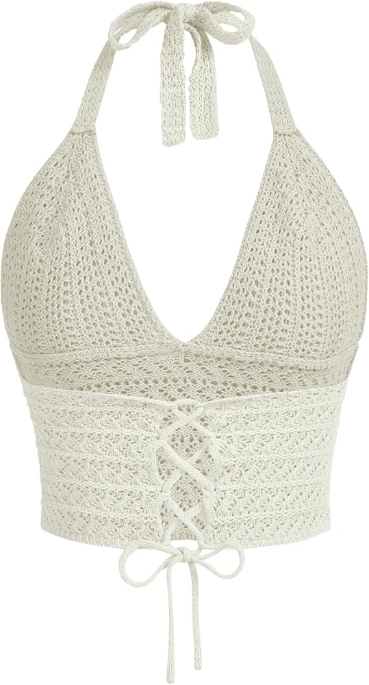 Design: Y2k v neck crochet knit cropped sweater tank tops for women, asymmetrical backless knitted cami shirts, aesthetic basic solid drawstring lace up halter vest, slim fitted self tie back boho sweater vests for 90s girls lady cute summer shirts