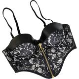 Faux Leather Stretchy Material,Light Padding Push-up Balconette Bra; Front-opened Zipper, Removable Straps. Our material is well stretchable, if you find out the Bra cups on you is loose, Please send back to exchange the one size down; if you find out the Bra cups on you can't cover the nipples, Please send back to exchange the one size up.
