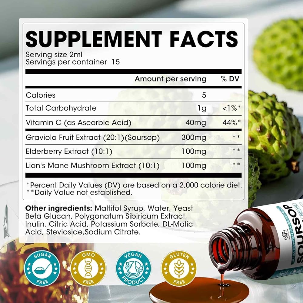 【Gut & Immune System Support】Our Soursop Liquid combines 300mg Soursop Graviola fruit extract with lion's mane mushroom and elderberry to naturally support digestive balance and immune health.This blend helps maintain gut comfort and nutrient absorption, while antioxidants from elderberry may support the body's natural defenses