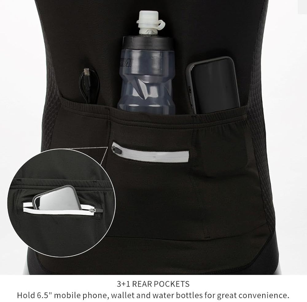 4 Pockets: 3+1 rear pockets provide convenient storage for your cycling essentials, such as water bottles, energy bars, wallet and a phone, with one pocket featuring a zipper closure for added security, so you can ride with peace of mind knowing your belongings are safe and easily accessible.