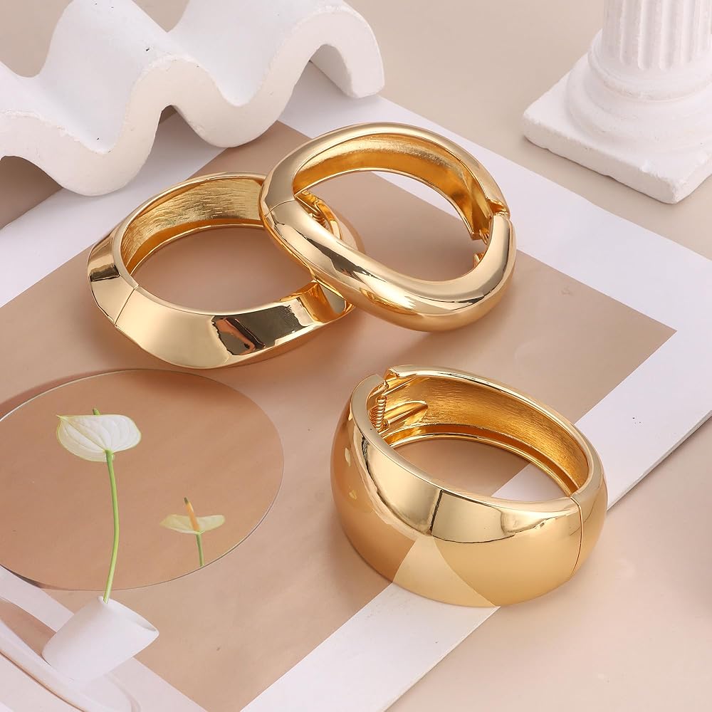 Easy On, Easy Off: Slip these gold cuff bracelets right on and off your wrist. No clasps, no hassle. The chunky gold bracelet style makes a strong statement. Perfect chunky bracelets for women