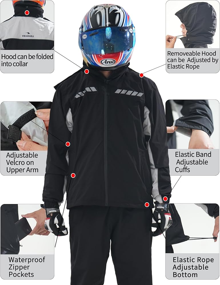 Rain Jacket: VIKAMAKA Rain Gear with a concealable hood that can be removeable or rolled into the collar for different occasions. Elastic cuffs, adjustable drawcord hood, elastic rope hem to prevent you from geting wet. And high reflective stripes around chest , it improved visibility in rainy weather or at night. And the front use waterproof zipper and 2 side waterproof zipper pockets to store your phone or wallet essentials