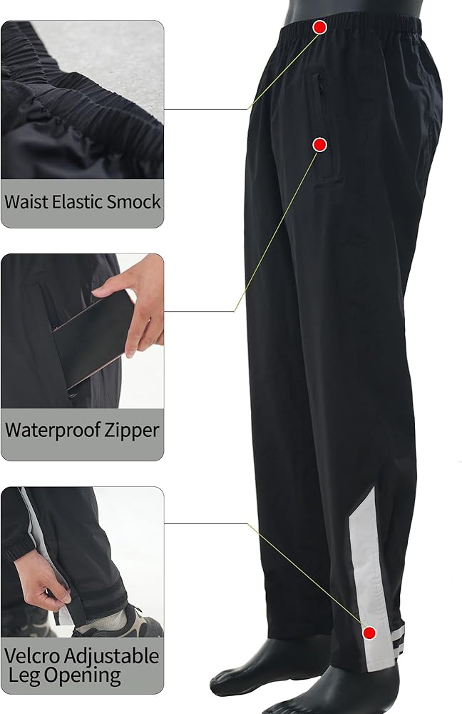 Rain Pant: VIKAMAKA hiking rain pant is fully elasticated waistband helps you customize your fit around waist. The loose leg opening can be closure by velcro to fit loosely over any boots, also to prevent rain from entering your legs. And leg opening with reflective stripes, it keeps you high visibility during outdoor activities. 2 waterproof zipper pockets provides extra storage space