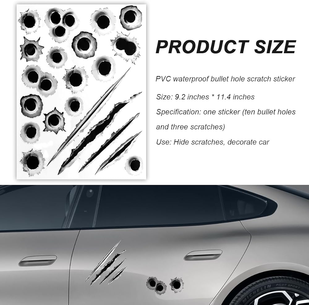 Cool and Funny: These bullet hole and scratch patterns are black and silver, providing a realistic three-dimensional effect to the car's avant-garde look, with fine detail and a stylish design to make your car cool and have a tough style. And it's fun to make a joke to your friends