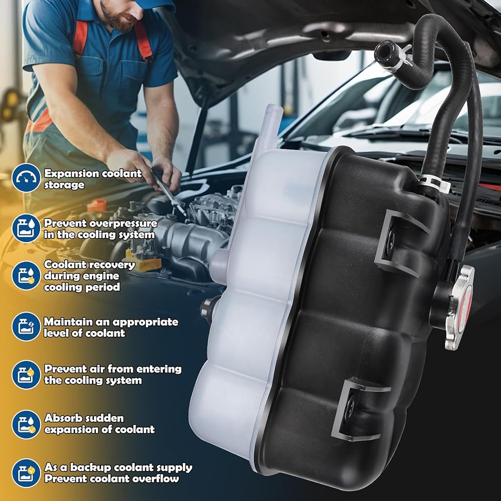 【Functions】The coolant reservoir is an important part of the engine cooling system and is designed to withstand the stresses of high temperatures and vibration to prevent coolant leaks. Reduce coolant loss and avoid the risk of high engine temperatures