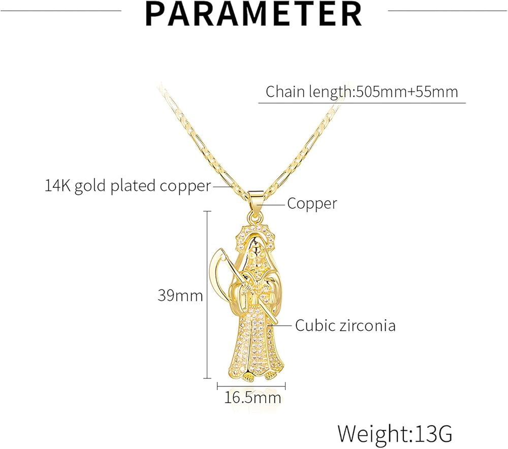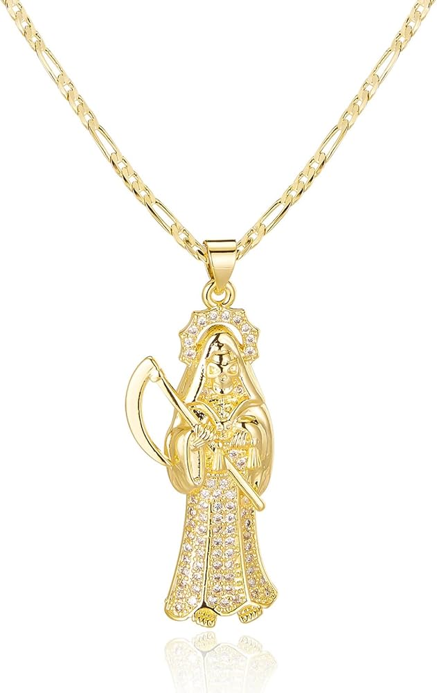 Express your faith and style with this Gold Plated reaper sicklePendant Necklace. Featuring an intricately detailed figure adorned with sparkling pave crystals, this necklace is a powerful symbol of devotion and protection. Crafted with high-quality materials, the gold-plated pendant ensures durability and a radiant finish, while the finely cut crystals add a touch of sophistication.
