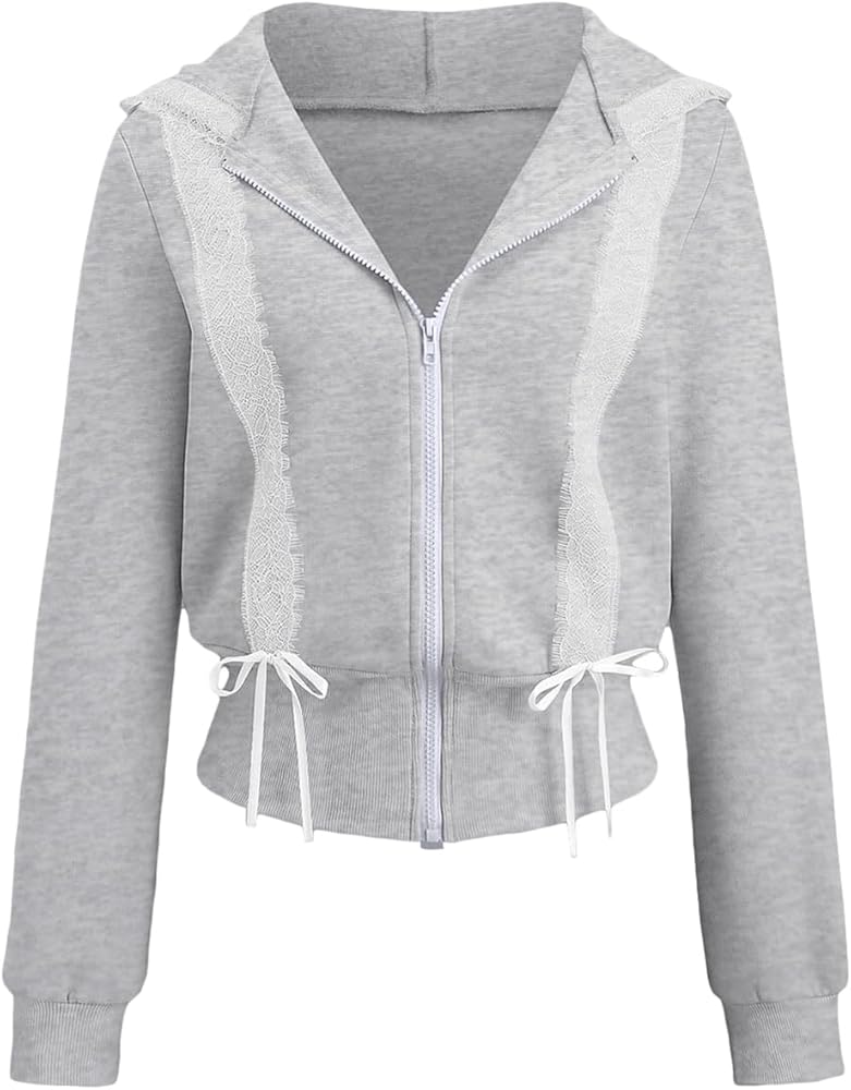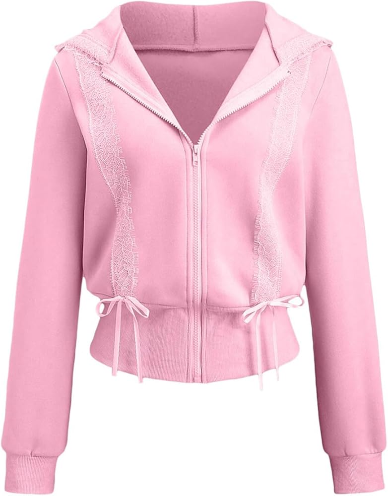 Material: Cute lace patchwork ribbon bow tie zip up crop hoodie jacket for teen girls is crafted from soft, lightweight fleece fabric for chilly fall winter and spring outfits