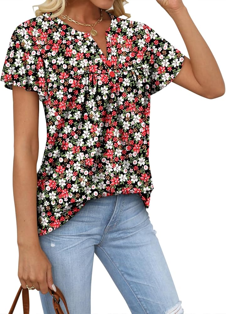 Features: Short sleeve,floral print, scoop neck, pleated on the front, easy to cover your belly and back area, Breathable and fitted, A variety of different printing designs are available to show your unique style