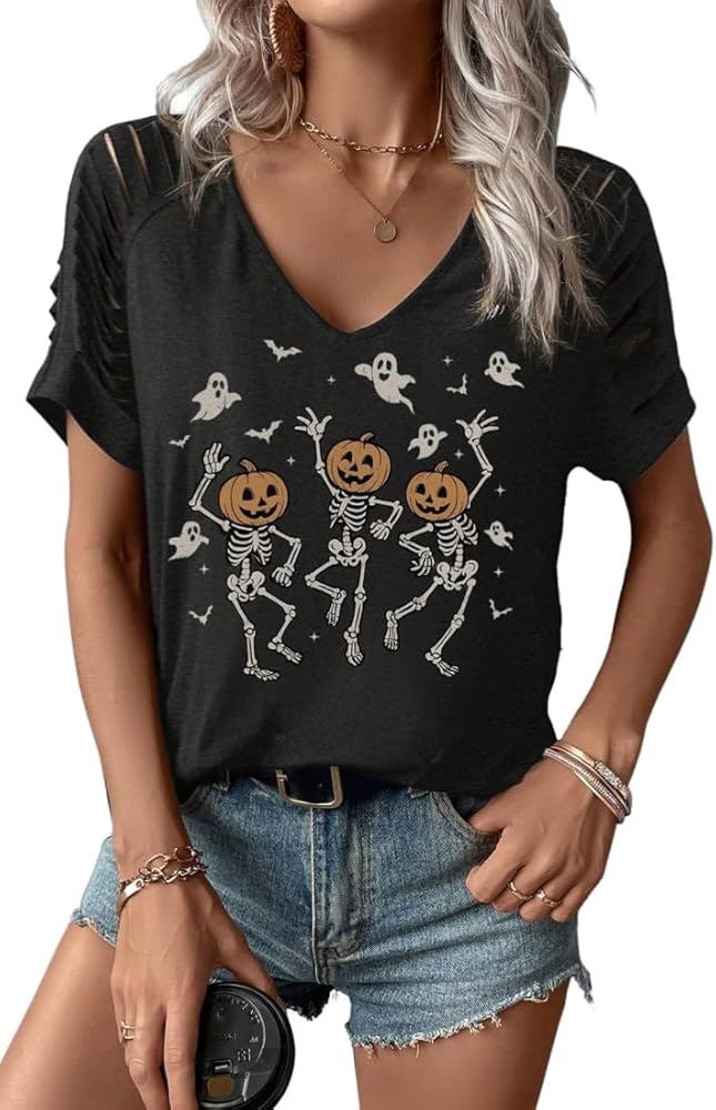 Feature:Sexy v neck cut out shoulder short sleeve t-shirt,fall halloween graphic v neck shirt,country music party tops,skull v neck shirt ,funny gothic graphic shirt,spooky season shirt,novelty horror tee,vacation family party shirt