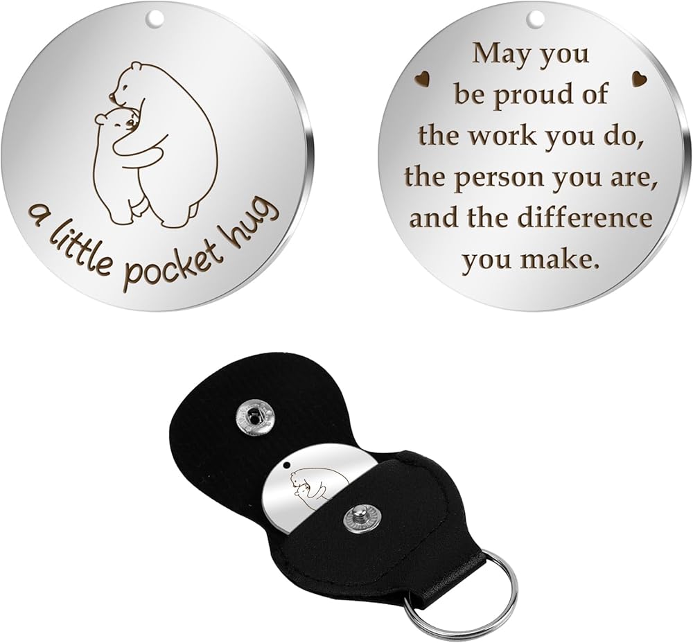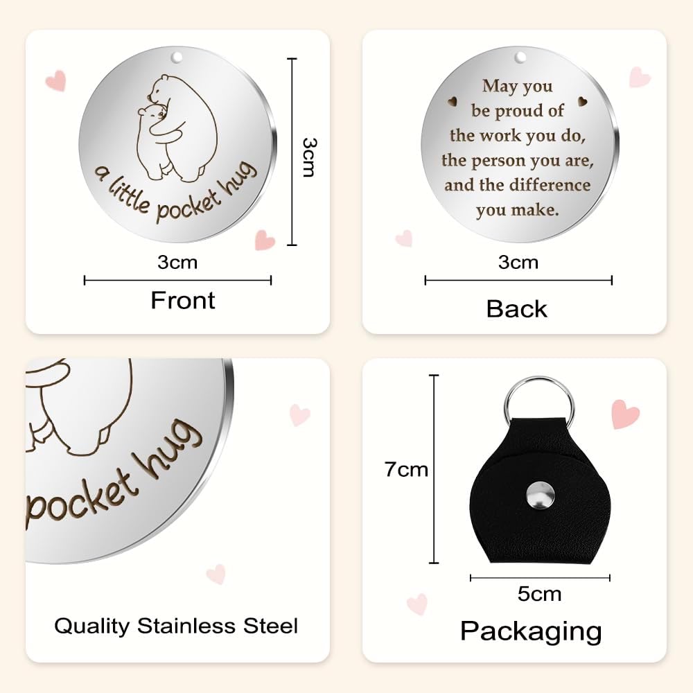 🍻 Exquisite Pocket Hug Gifts: The inspirational pocket hug tocken is made of high quality stainless steel, not easy to rust or damage, not deformed, not allergic, not faded or discolored, perfect for giving as a gift. The length and width of the hug sign are both 3cm, and the included leather cover is 7cm long and 5cm wide. The souvenir can be well protected by the leather cover. The keychain cover is made of high-quality PU leather, which is soft and lightweight, suitable for long-term use.
