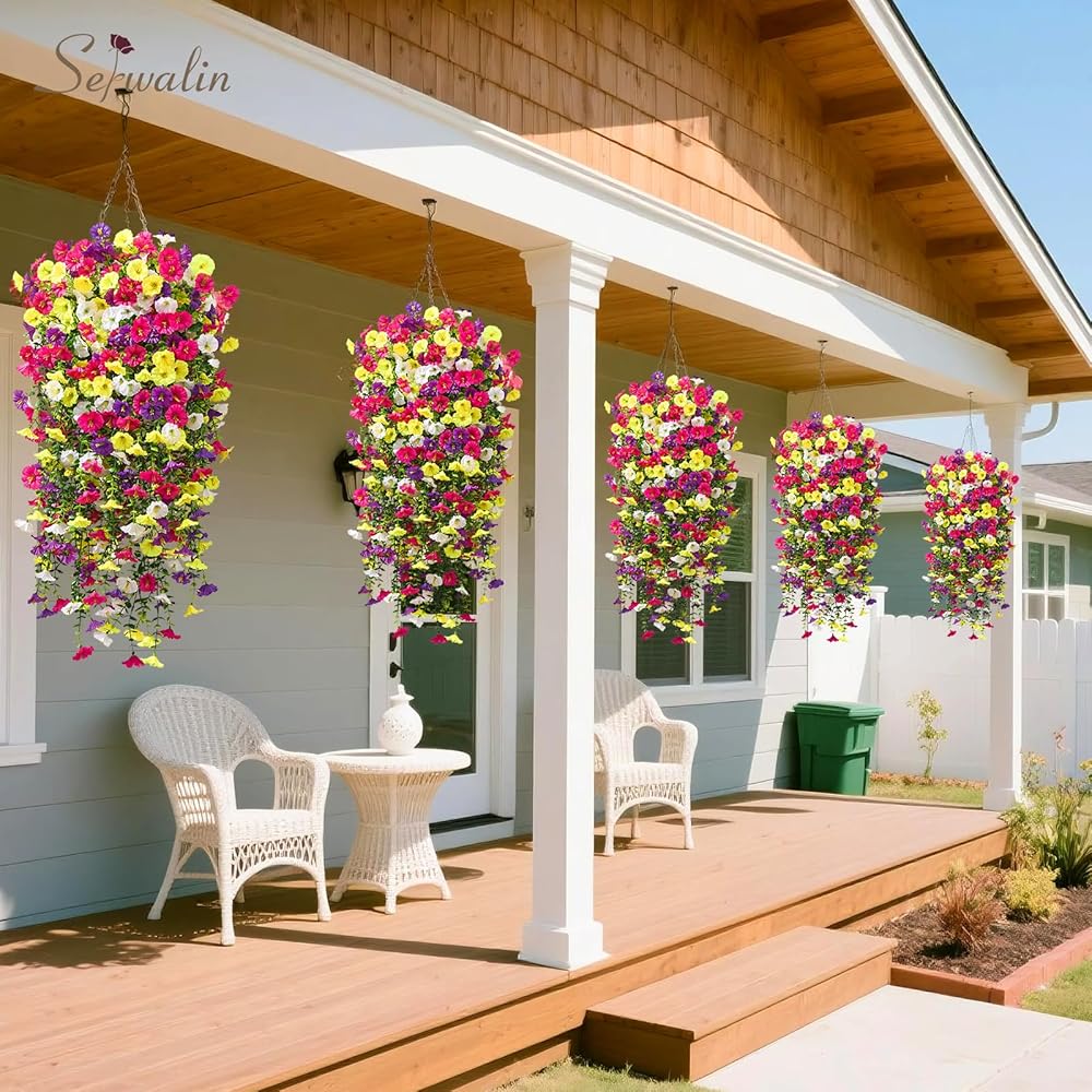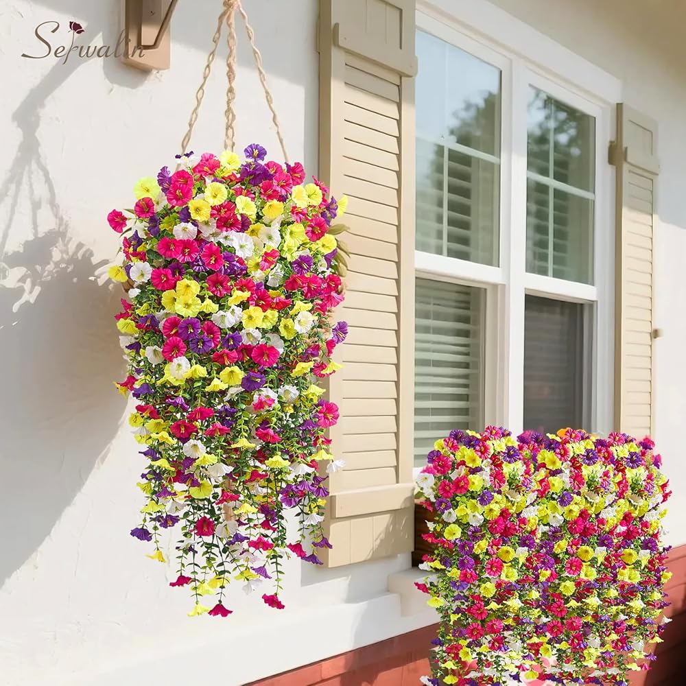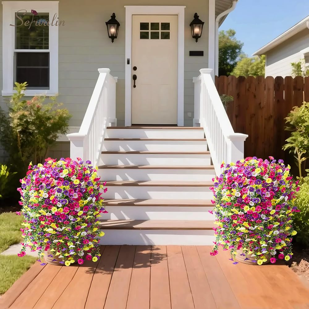 Warm Tips: 2Pcs artificial hanging flowers can meet common basket sizes for decoration. If your flower bed is larger, we recommend using 4/8pcs or more to achieve the desired decorative effect. Due to packaging and transportation reasons, our artificial flowers for outdoors May fall off or be squeezed, you can manually restore them or use cold air to help quickly restore their fullness