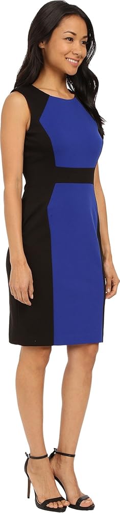 A color blocked sleeveless sheath with round neckline and center back zipper closure
