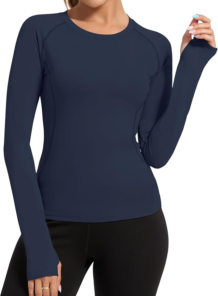 The thoughtful design features thumbholes to prevent riding up during movement, a classic crew neck for a timeless look, and four-way stretch fabric that moves with you for unrestricted flexibility.