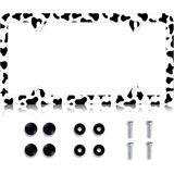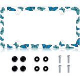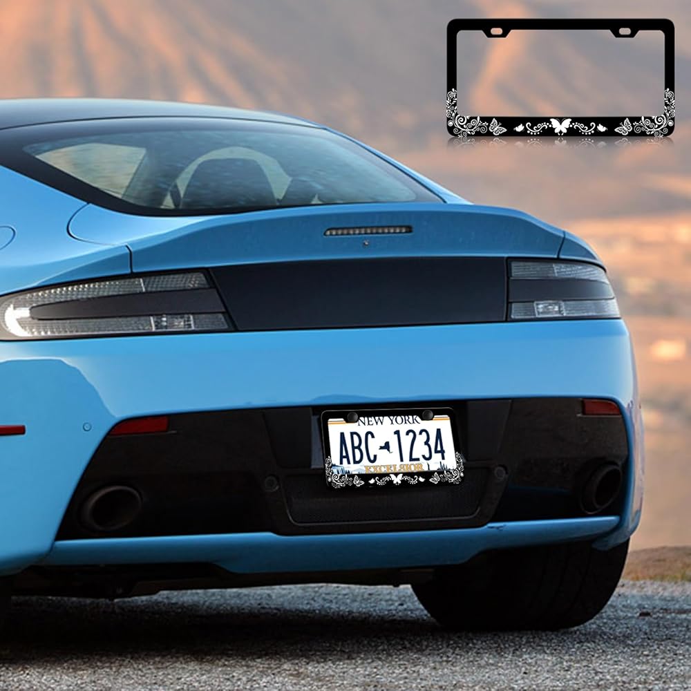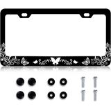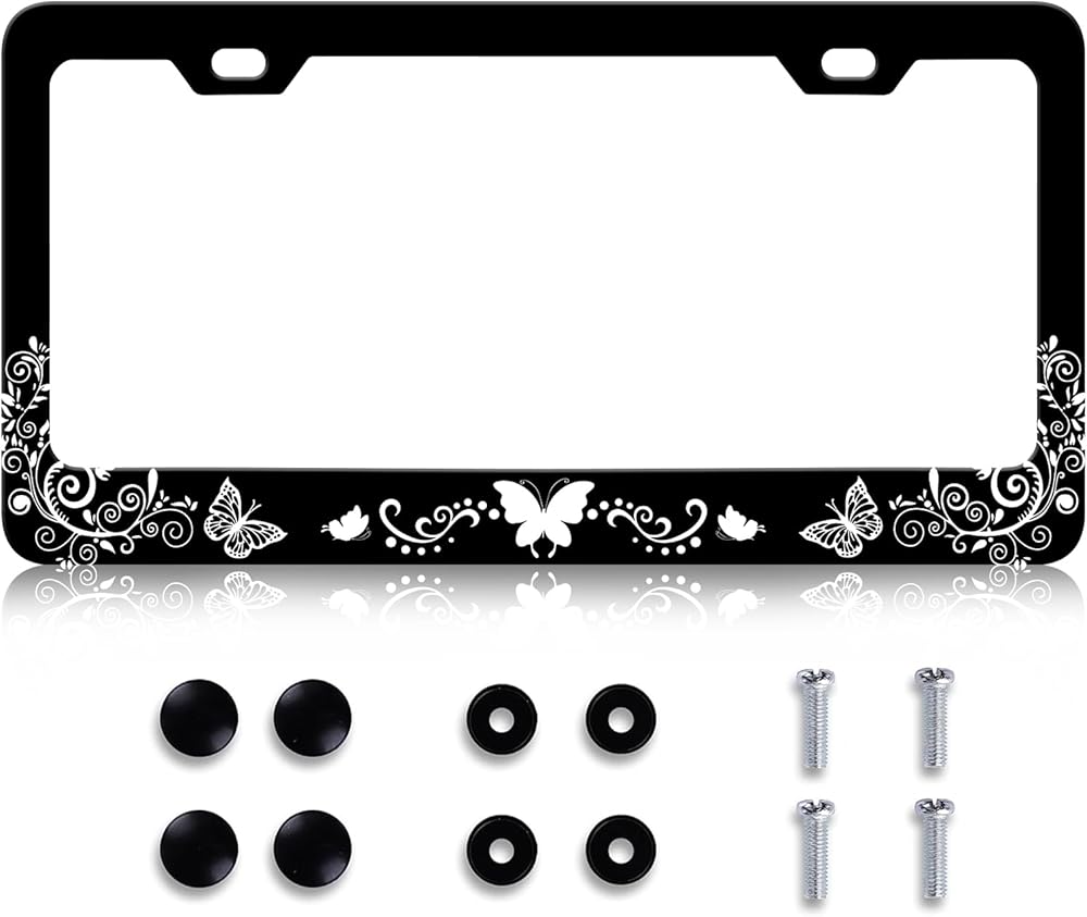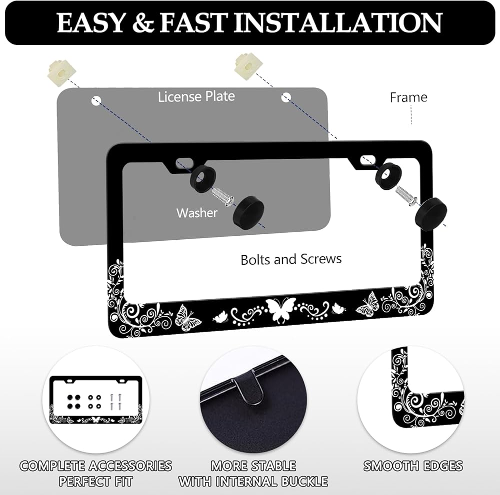LIN KANG Black White Butterfly License Plate Frame Funny Butterflies Floral License Plate Holder Stainless Steel Auto Parts Rust-Proof Waterproof Car Decorative Tag Frame for Standard US 12x6 Inch
