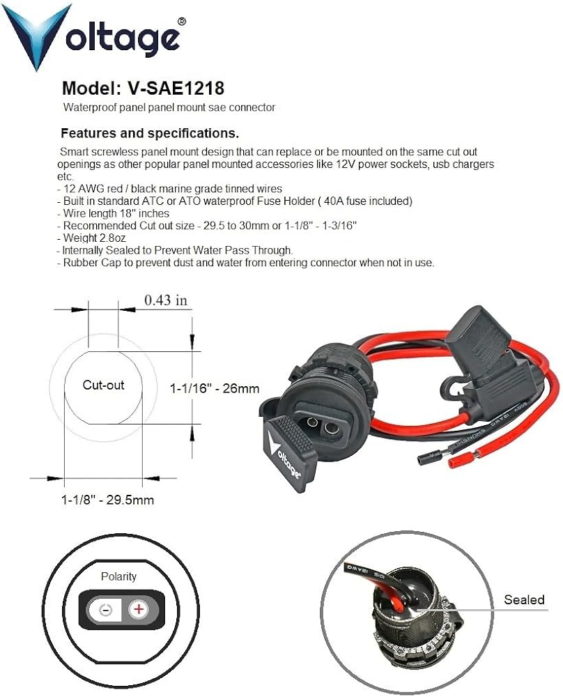 Voltage SAE Panel Mount Connector Socket with Fuse Waterproof SAE Quick Connect for Kayak, Boat, Solar Panel, Flush Mount 12AWG 18" V-SAE1250