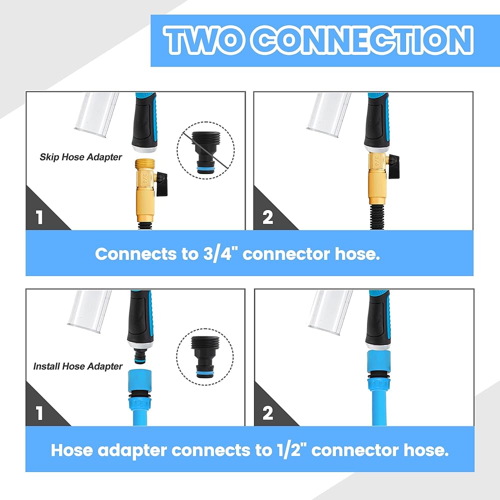 【Wide Application Hose Nozzle 】 The washing spray nozzle comes with quick connector ports and rubber gasckets, fits any standard garden shower water hose, you can easily connect it with your garden hose, The foam sprayer is made of high-grade plastic, this garden hose nozzle is easy to grip, slip-resistant and comfortable fit