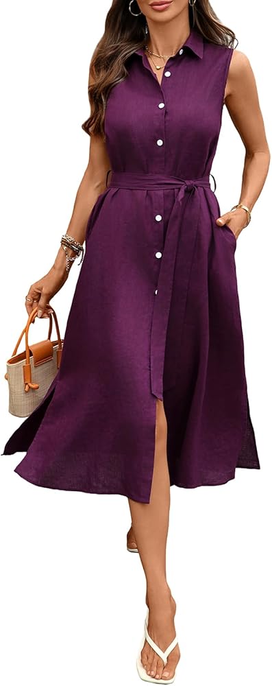 Core Features & Fit: This button down dress for women features a flattering sleeveless design, a chic button-down front, and a side slit for movement. The belted waist enhances your silhouette, making it ideal for both casual and dressy occasions. A perfect addition to any collection of midi linen dresses for women