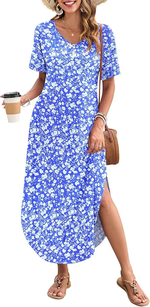 Features: V neck short sleeves long dress for women, maxi dress for women with two side pockets, sexy side split, button down casual dresses, loose fit summer beach dress, floral maxi dress, solid vacation dress. The V neck maxi dress is a great simple design that flatters your figure, flowy and swing, makes you more elegant and fashionable.