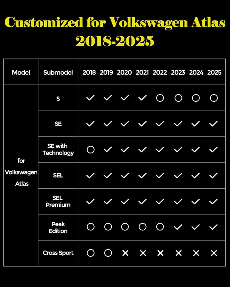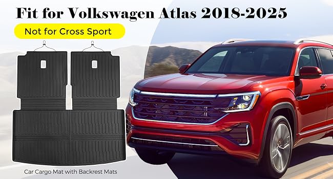 Custom Fit: The floor mats for vw atlas 6/7 Seats 2018-2025. Our trunk liner with backrest mats for Atlas SE/ SE with Technology/ Peak Edition SE with Technology/ SEL/ Peak Edition SEL/ SEL Premium R-Line. Not fit for Atlas Cross Sport — confirm vehicle model/year before purchase