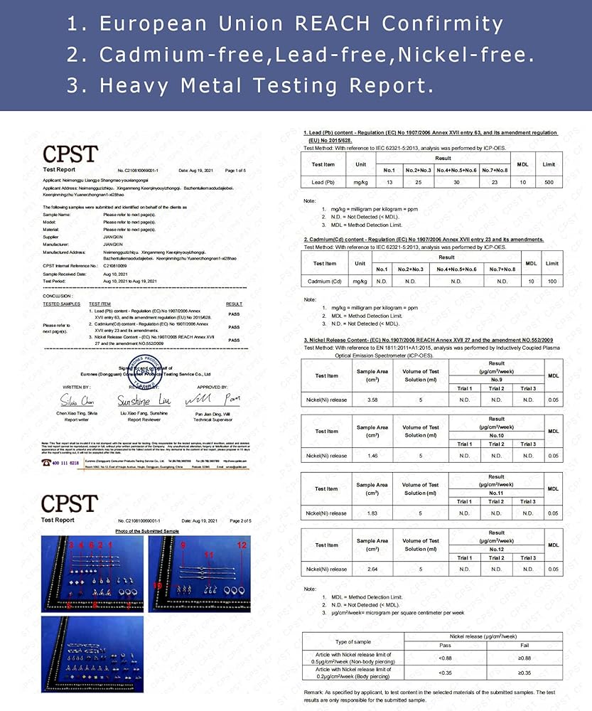 All JIANGXIN jewelry have passed European REACH Heavy Metal Test. Cadmium-free, Lead-free, Nickel-free, Safe to wear!