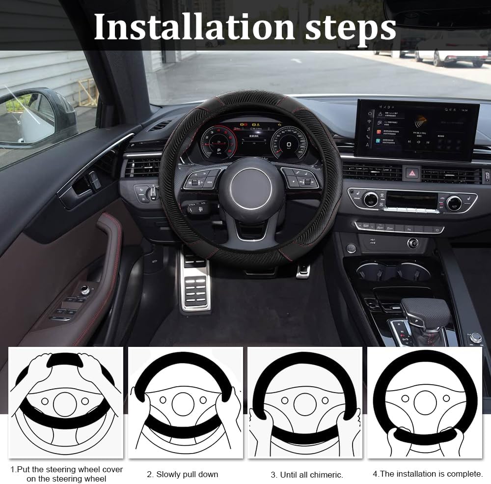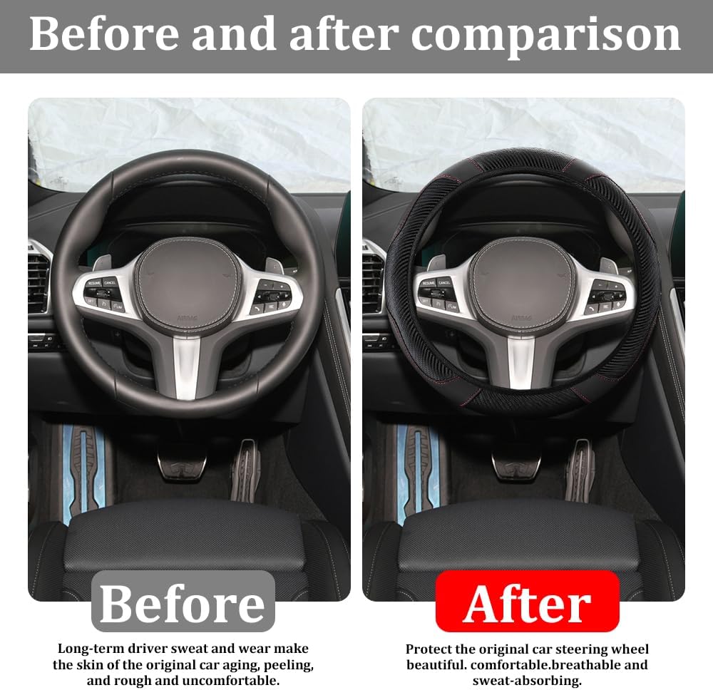 Features:The car wheel cover is made of carbon fiber leather, non-slip and wear-resistant, allowing you to better grip the steering wheel to ensure driving safety, while the steering wheel cover of the patchwork color design can also add fashionable and cool charm to your car, adding driving fun