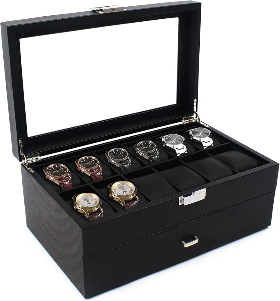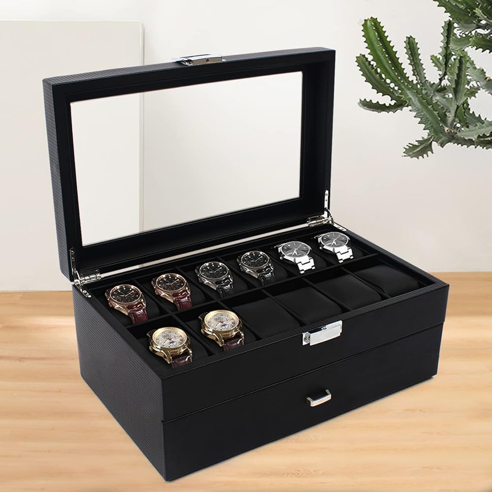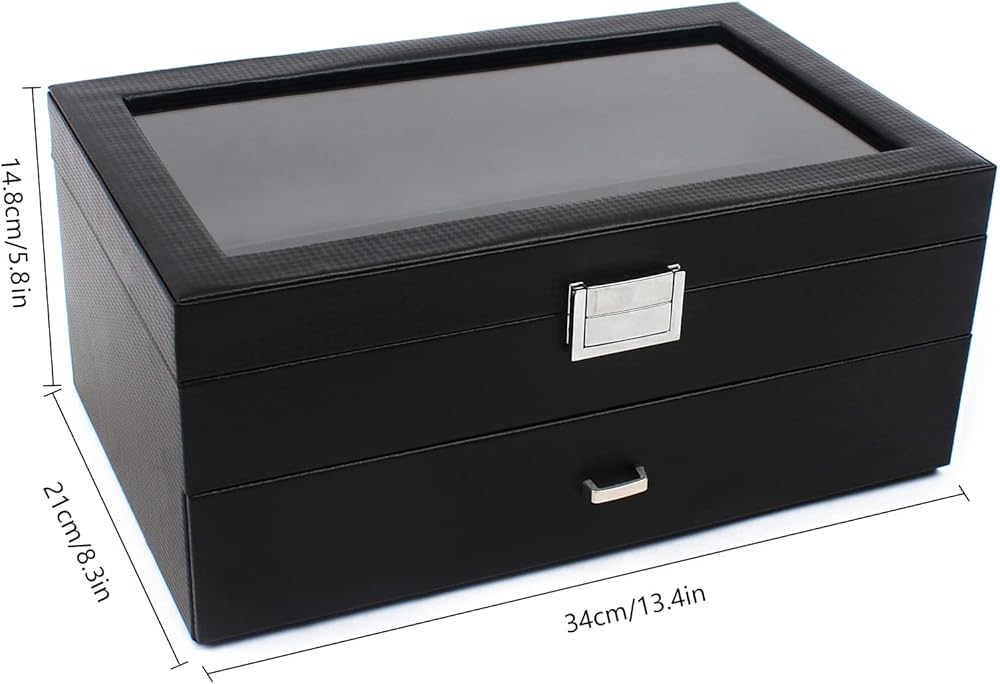 Carbon Fiber Watch Box for Men, 24 Slot Watch Case Organizer with Double-Deck & Glass Top, Lockable Watch Display Case, Jewelry Holder Cabinets 13.4 * 8.3 * 5.8 in