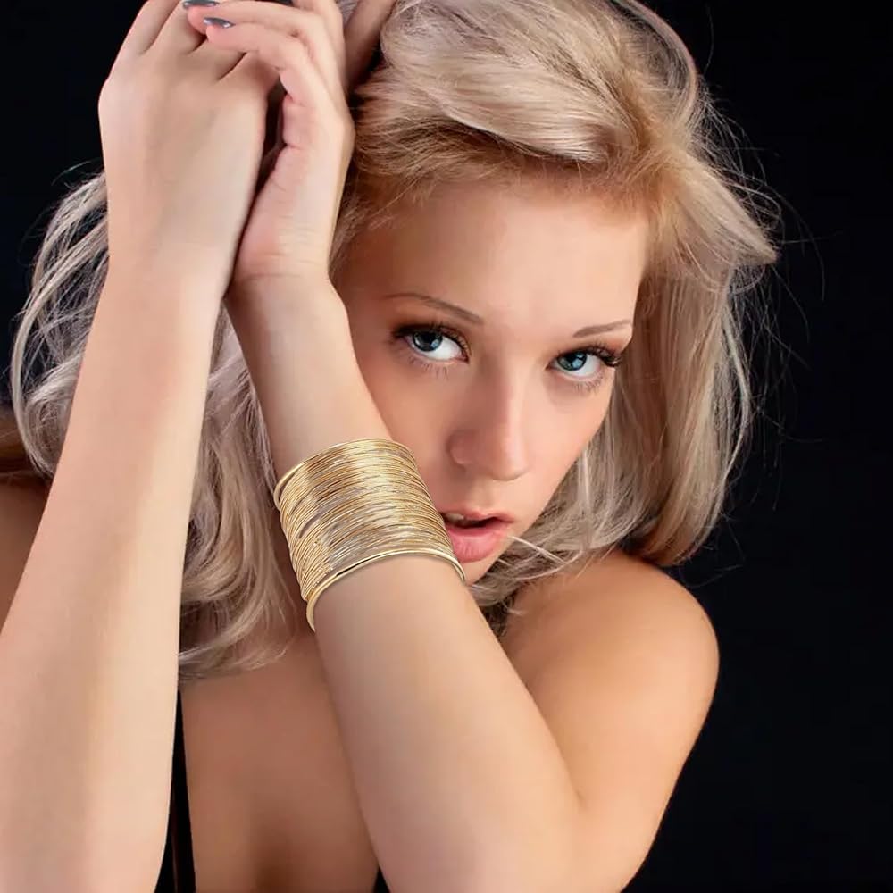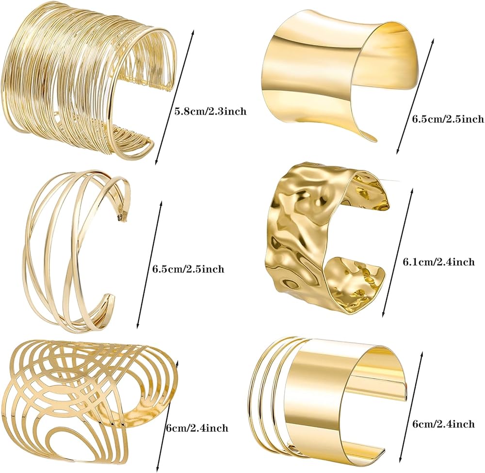 What you will get: This 6-piece gold cuff bracelets set includes all trending styles: gold wire bracelet, grooved metal cuff, hammered chunky cuff bracelet, five-line vintage boho wide bangle, three-line minimalist thick bangle, and irregular statement bracelet. These open wide wire bracelets set is ideal as both punk jewelry and bridal party jewelry