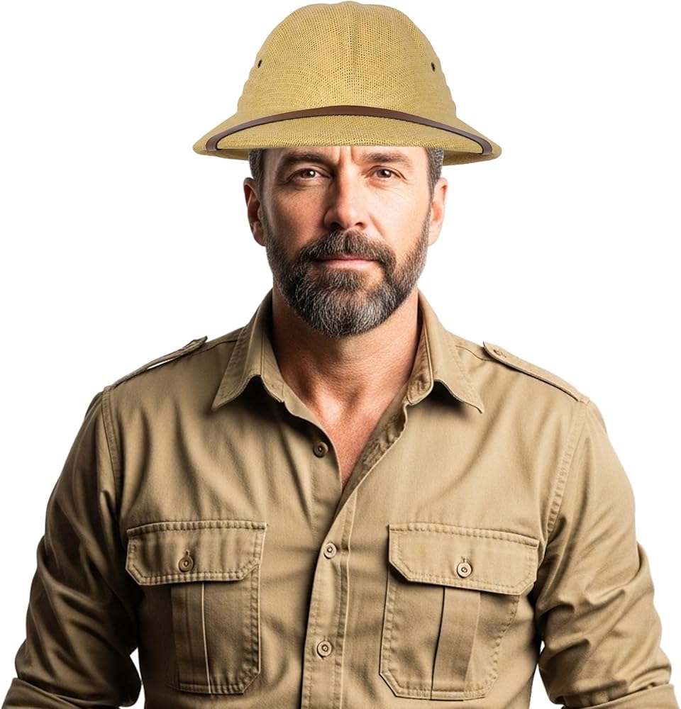 Step into the role of an intrepid explorer with this classic pith hat helmet, a timeless symbol of adventure and discovery. Perfect for safari costumes, jungle expeditions, or historical reenactments, this pith hat captures the essence of colonial-era exploration gear. The adjustable fit ensures comfort during your adventures, whether you're dressing up as a British army officer, archeologist, or mailman. The distinctive dome shape and wide brim design are instantly recognizable, offering that authentic vintage look that's essential for period costumes. This versatile headpiece works wonderfully as part of a complete explorer ensemble or as a standalone costume accessory. The lightweight construction makes it comfortable for extended wear during parties, Halloween, or themed events. Transform yourself into a daring adventurer ready to navigate uncharted territories with this iconic piece of costume headwear.