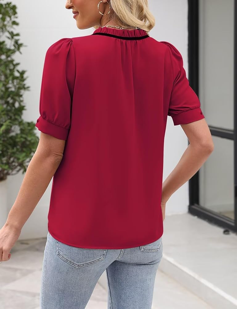 Fashion Design: The office top features with color-block design, cute tie front, puff short sleeve, chic button