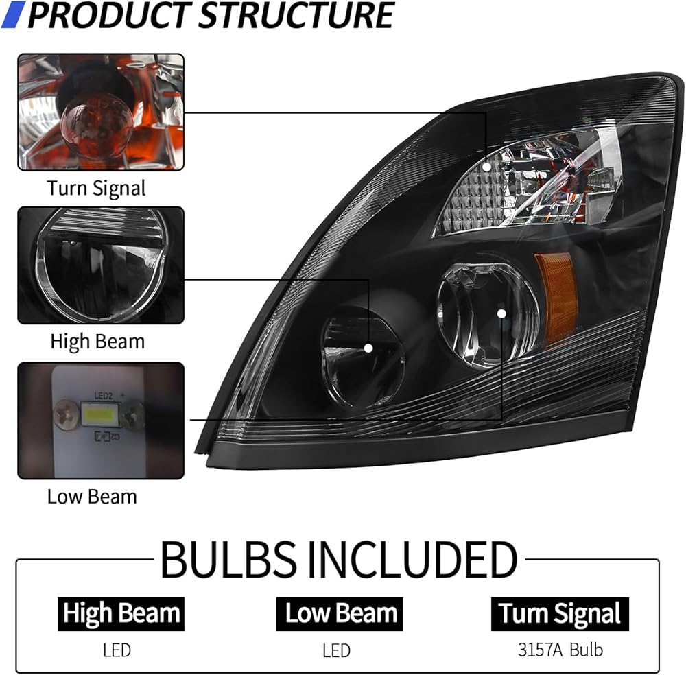LED Headlight Assembly Compatible with Volvo VNL 2004-2014,Black Factory Style LED High/Low Beam Headlamp Driver and Passenger (Left/Driver Side)