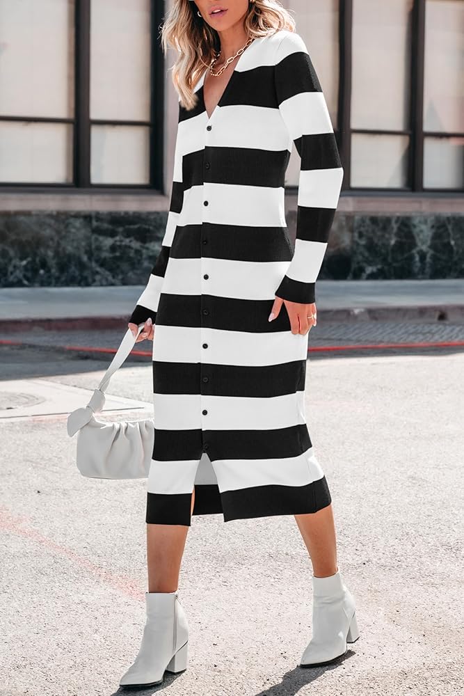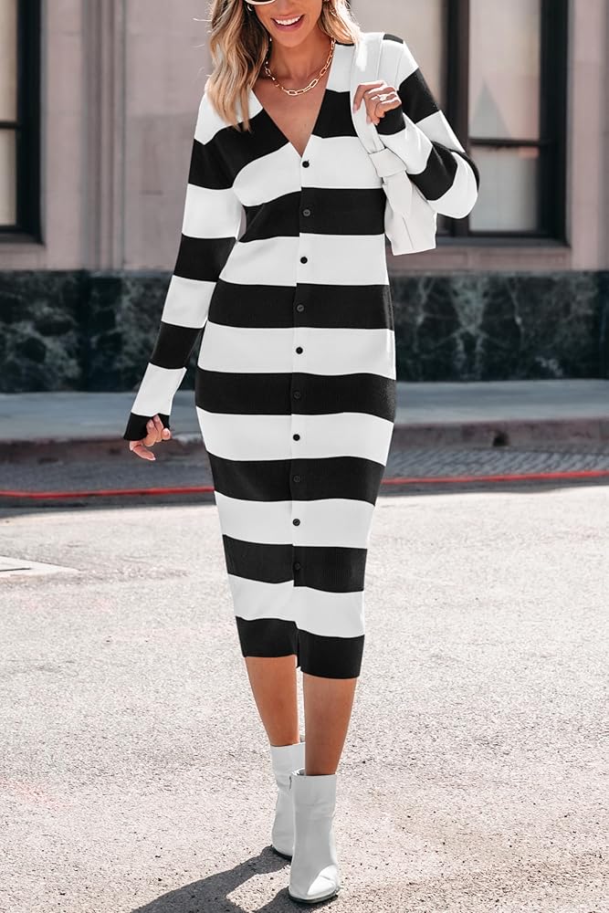 Feature: S=US 4-6, M=US 8-10, L=US 12-14, XL=US 16-18, XXL=US 20 / Long Sleeve Sweater Dress 2025 / Open Front Cardigan Sweaters For Women / V Neck Long Dress / Long Thick Sweaters Dress / Button Down Dresses / Stripes Button Up Sweaters Dress / Midi Bodycon Dresses / Ribbed Knit Dress / Suit For Spring Fall Winter