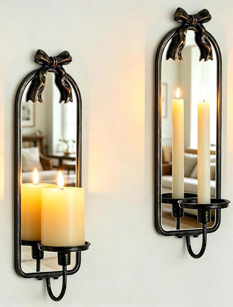 Candle Sconces Black Wall Decor: Set of 2 Metal Wall Candle Holder Decorative for Taper Pillar Candles - Vintage Bow Mirror Sconces Art for Fireplace Bathroom Livingroom