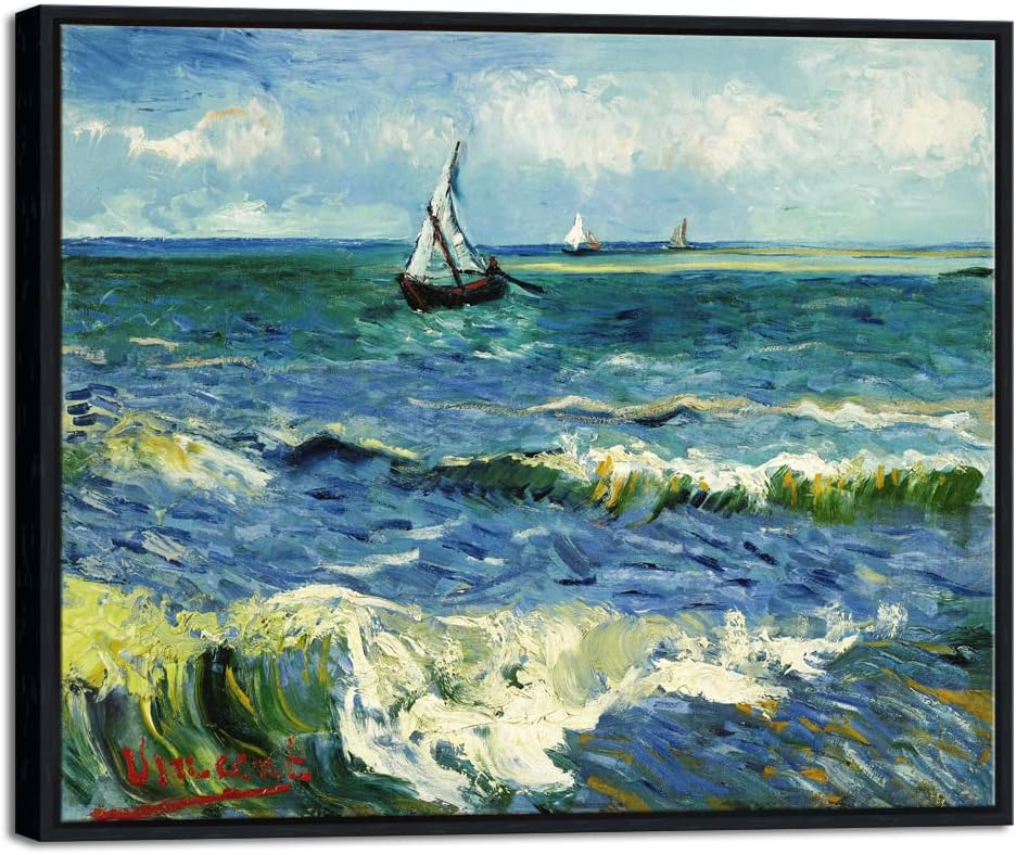 Wieco Art Black Framed Art Seascape at Saintes Maries by Vincent Van Gogh Oil Paintings Reproduction Modern Canvas Prints Sea Pictures on Canvas Wall Art for Living Room Home Deco