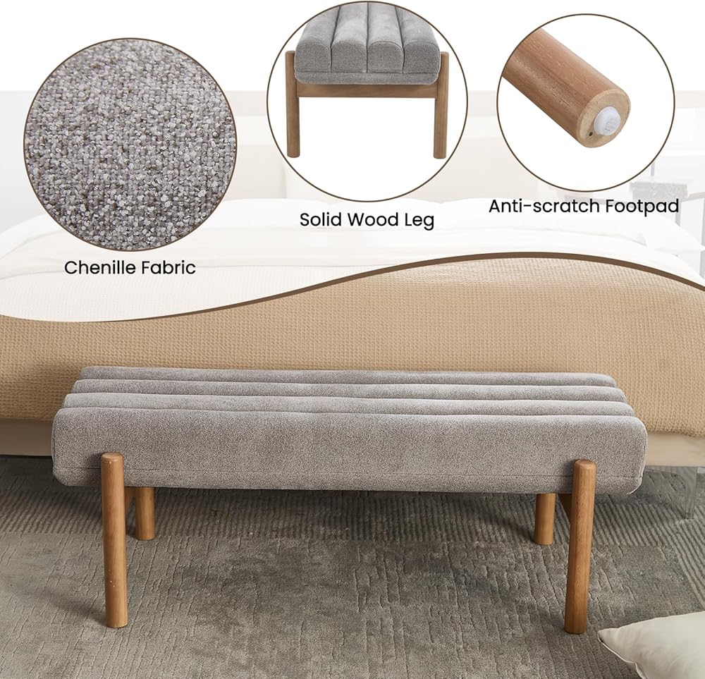 VESCASA Upholstered End of Bed Bench with Solid Wood Legs, Modern 47" W Entryway Bench with Comfortable Soft Cushion Seat for Living Room, Bedroom, Hallway, Chenille Grey