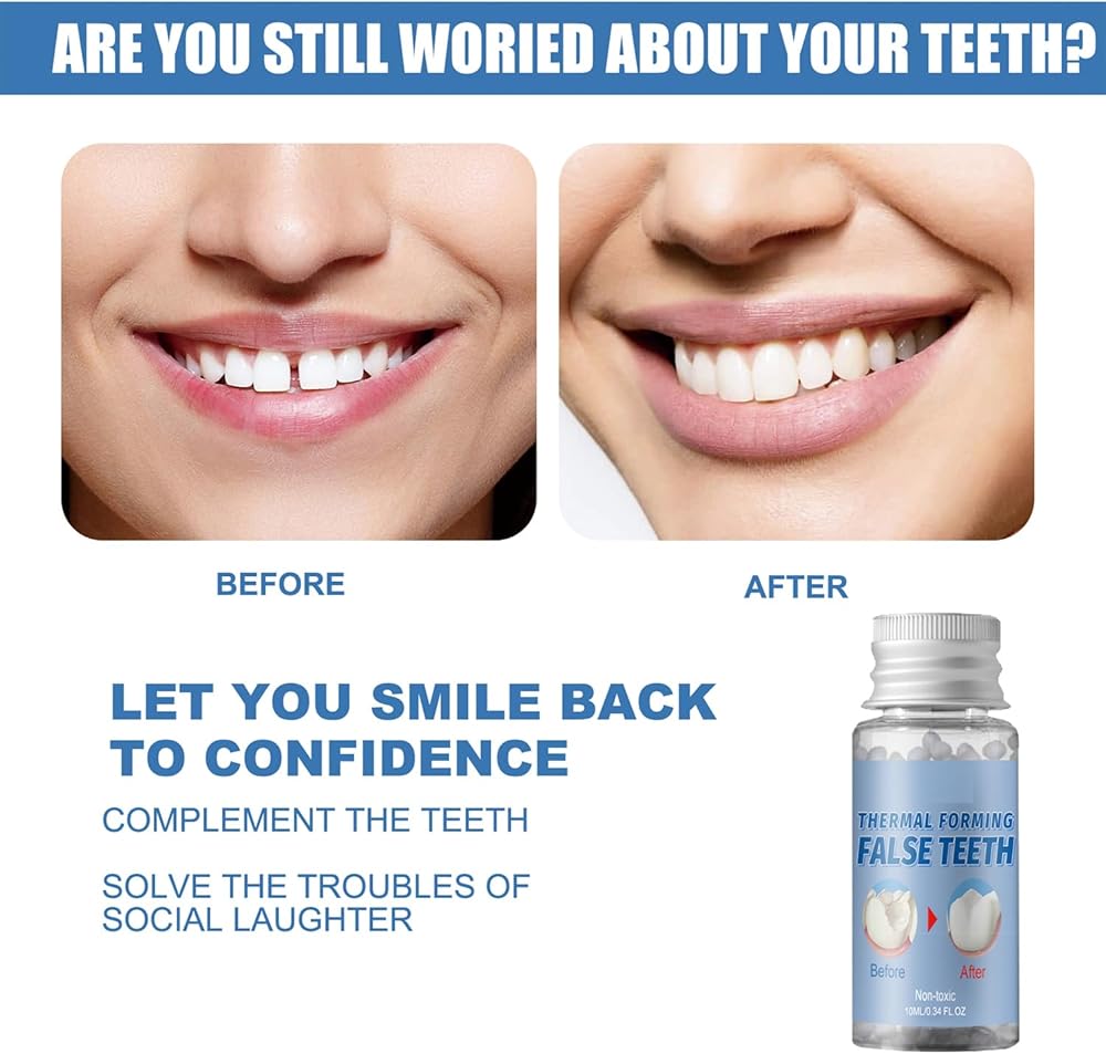 Transform your smile with Thermal Forming False Teeth solution. This innovative 30ml dental product offers a reusable and super strong solution for temporary cosmetic teeth enhancement. The thermal forming technology allows for custom shaping and fitting, while the non-toxic formula ensures safe application. The versatile material can be painted, dyed, machined, carved, and pasted to achieve desired results. Perfect for those seeking a quick and convenient way to address cosmetic dental concerns, this solution helps create a natural-looking appearance. The easy-to-use formula works through a simple thermal forming process, making it accessible for home use. Each 30ml bottle contains enough material for multiple applications, offering great value. For best results, follow the included application instructions carefully. This temporary solution provides a practical option for those looking to enhance their smile's appearance without permanent alterations.