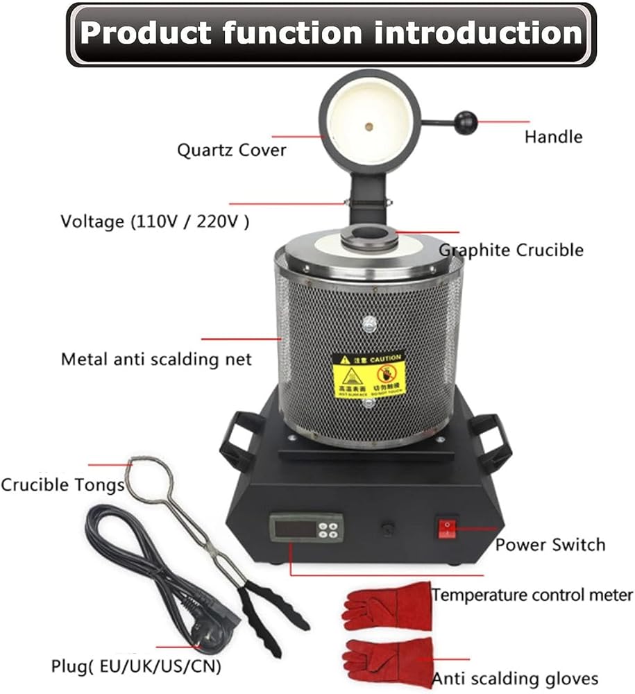 High-efficiency melting furnace: power 1400w, voltage 110v/220v, maximum heating temperature 1150℃/2100°f,The time is about 10 minutes shorter than the ordinary style. Note: The single working time of the smelting furnace machine should not exceed 3 hours.