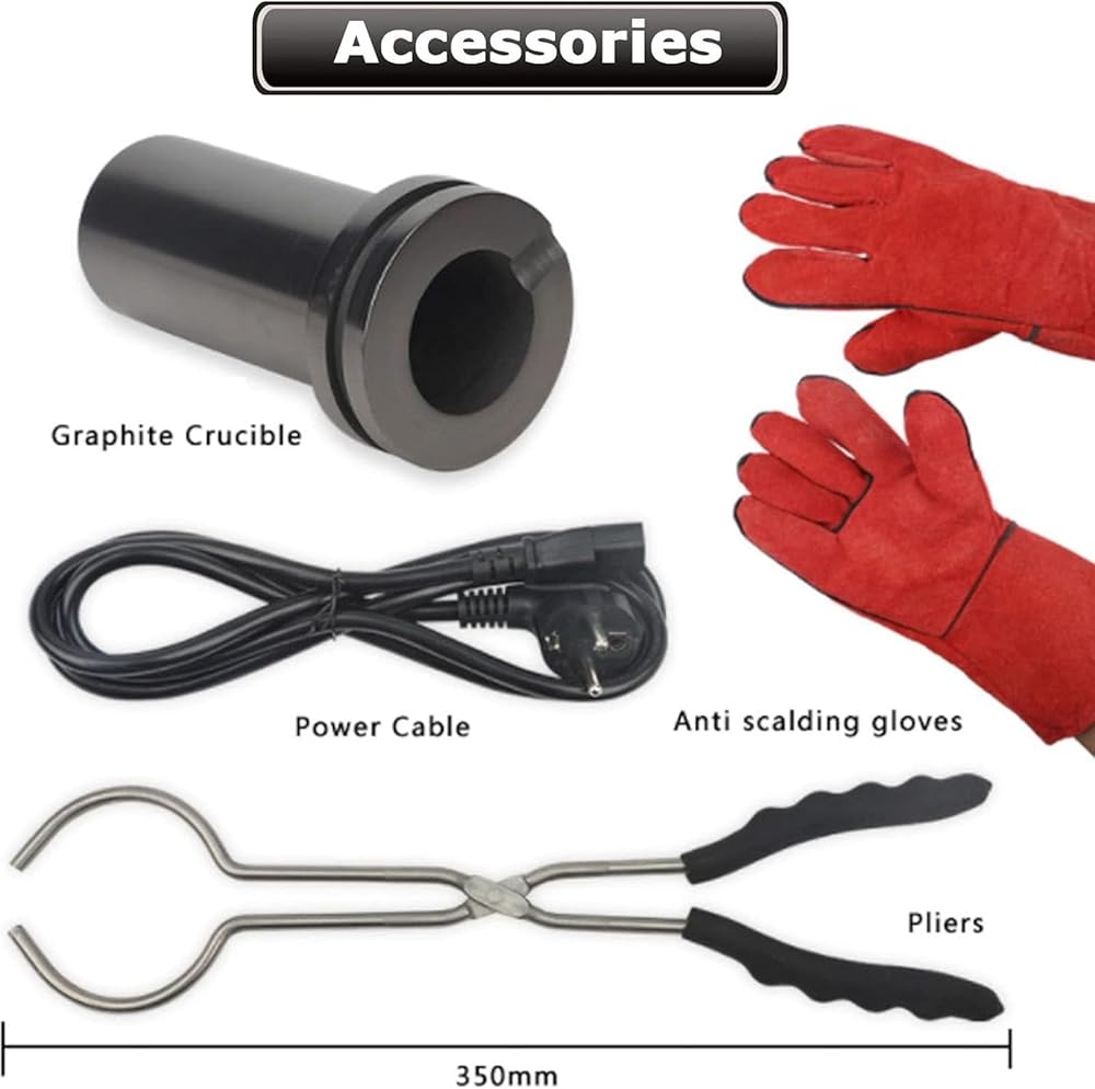 Seven-in-one gold melting machine: Curved crucible tongs are ideal for picking up graphite crucibles and pouring them into ingot molds. Anti-scald gloves can help with opening the melter. Insulated lid retains heat and seals out oxygen for cleaner melt.