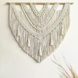 Large Woven Tapestry: 43" W x 32" H (from top to the ends of longest fringe) This macrame wall hanging is great for a bedroom, living area, workspace, or anywhere where you'd like to bring some texture and interest to your walls.