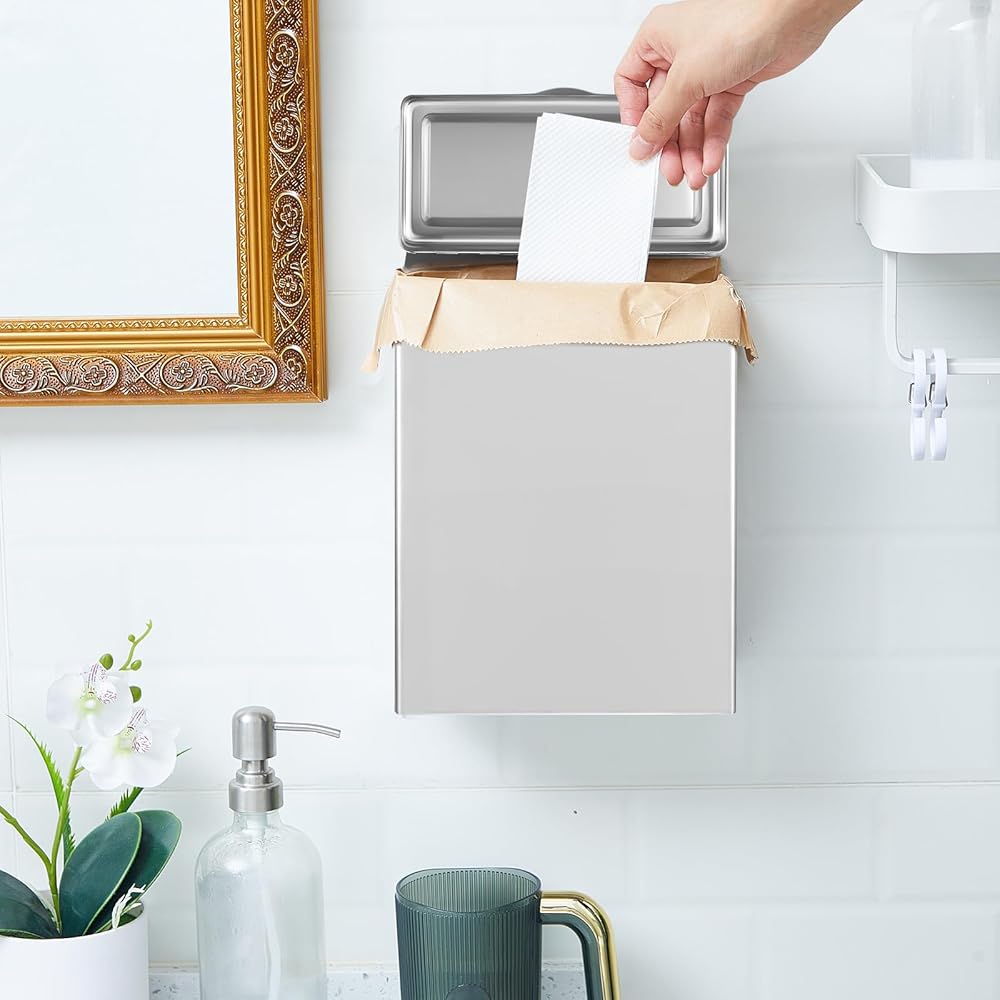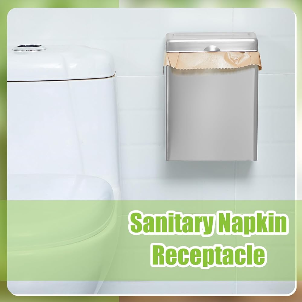 Quality Material: the commercial bathroom trash can is made of quality stainless steel material, sturdy and durable, waterproof, rustproof and corrosion resistance; The sanitary napkin storage bag is made of brown kraft paper, waxed to prevent moisture, with strength and durability, you can use them with confidence