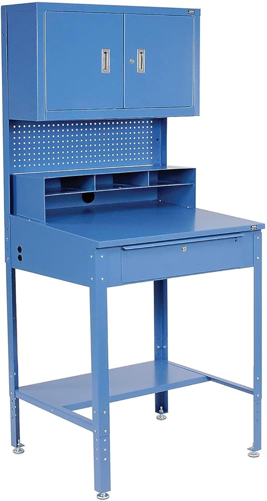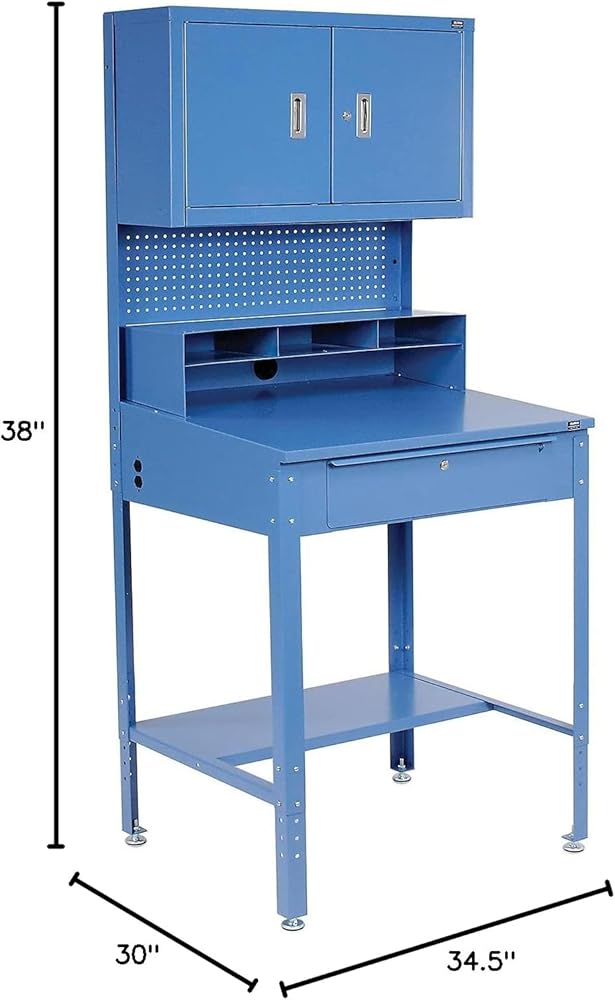 Global Industrial Shop Desk w/Pigeonhole Compartments, Cabinet Riser, 34-1/2"W x 30" D x 38 to 42-1/2"H, Blue